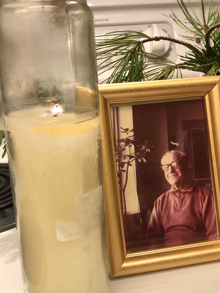 Today is the 37th anniversary of my father’s death. His Yahrzeit. This morning, I pulled from a shelf in my pantry one of the partially burned seven-day memorial candles leftover from the last Yom Kippur service I attended, in 2018. I would ordinarily light a 24-hour candle to mark his passing, but this is not an ordinary year. It needs all the light it can get on its way out and I decided that having a candle burning on my stove shrine for a few days would not be a bad thing.