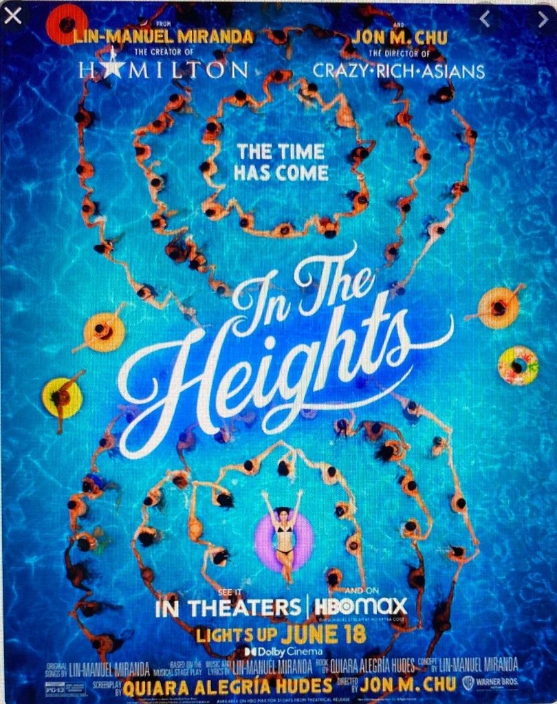 The movie we saw was In the Heights. It is filled with the vibrancy of community. Love, sorrow, expectations, hope and joy filled every frame. It, also, faces the reality of Dreamers, people who are undocumented, gentrification and daily racism with the respect these topics deserve. The social issues are woven throughout the plot line, giving a formidable stage on which to waken the world.