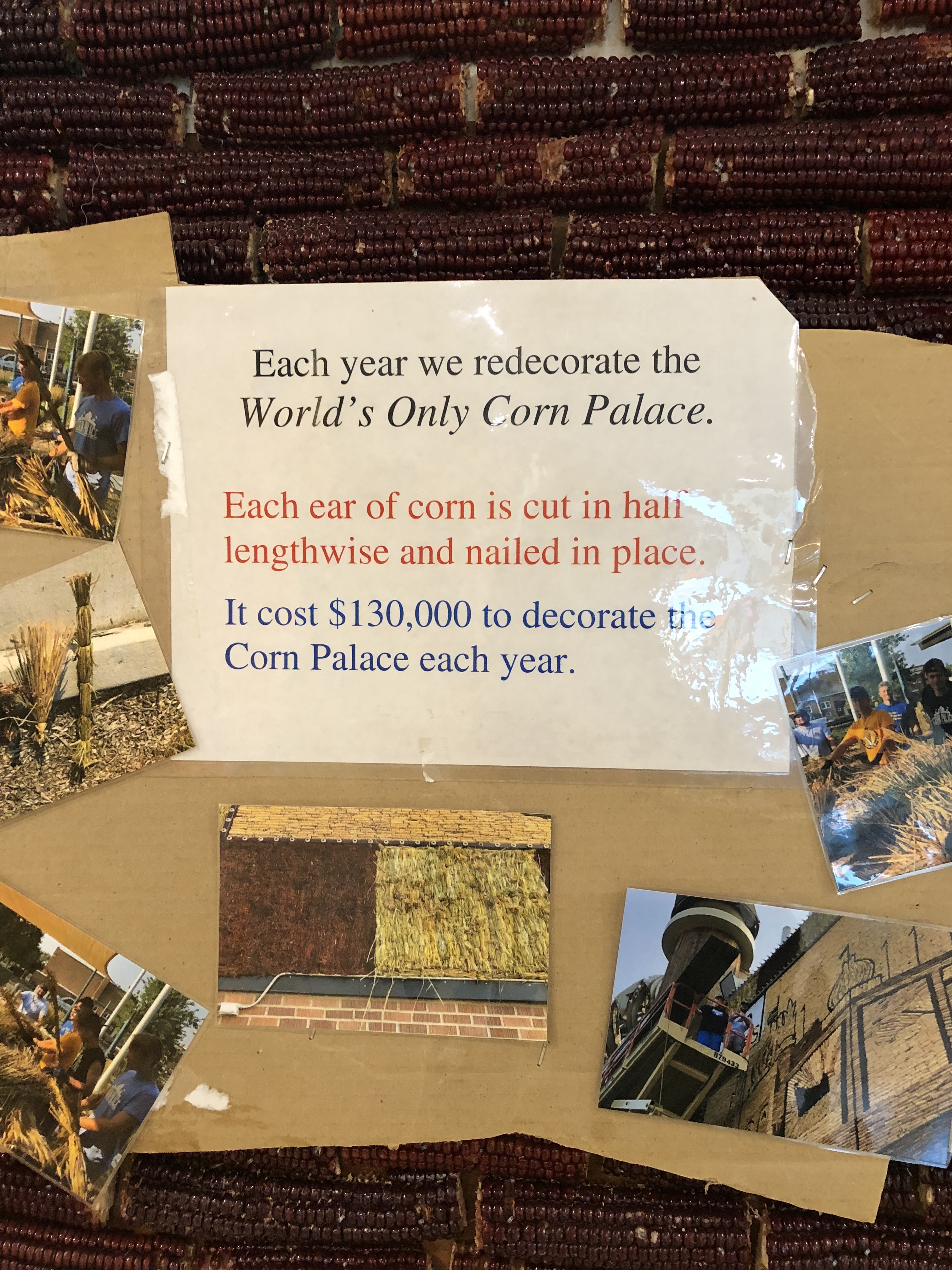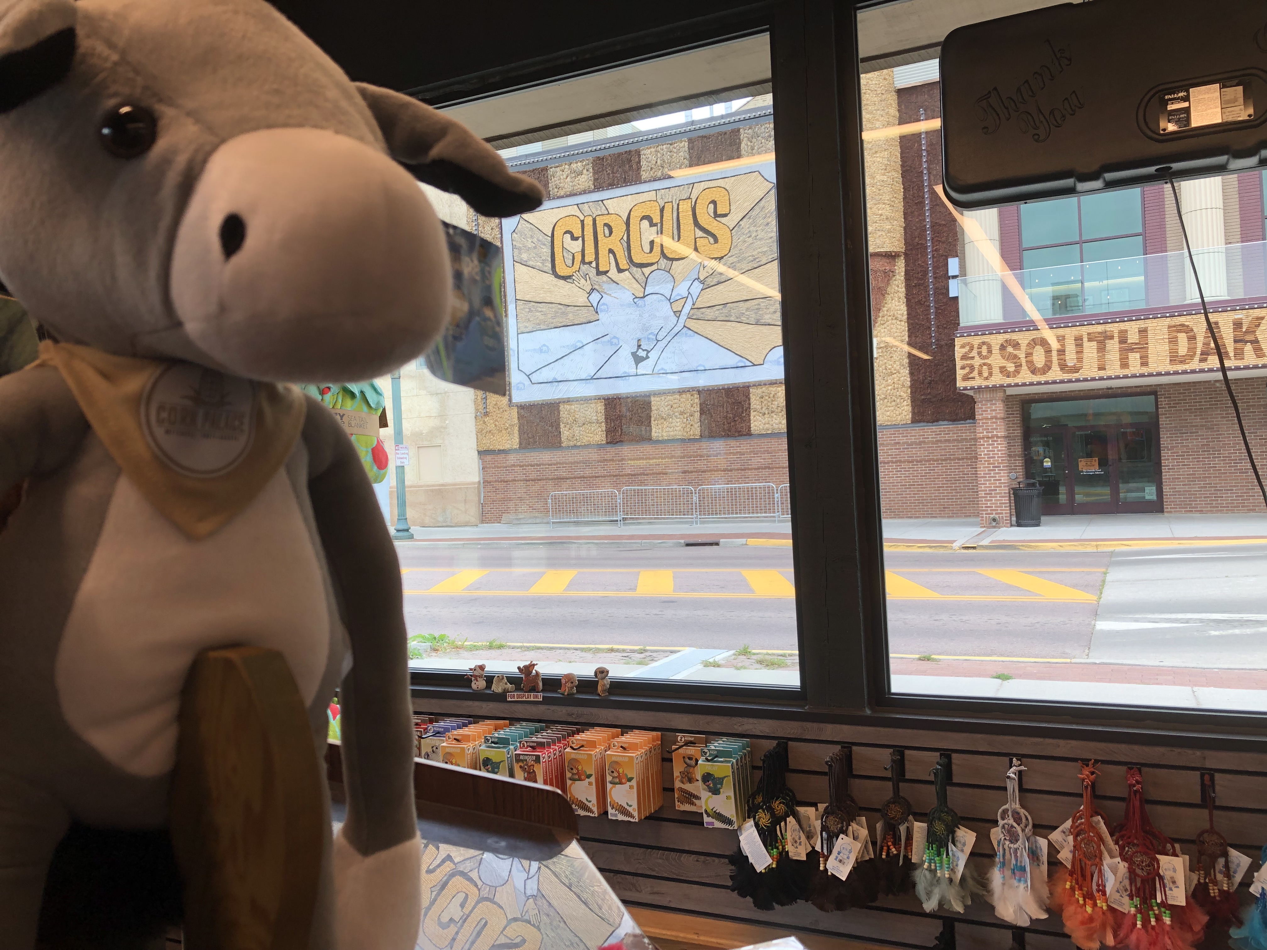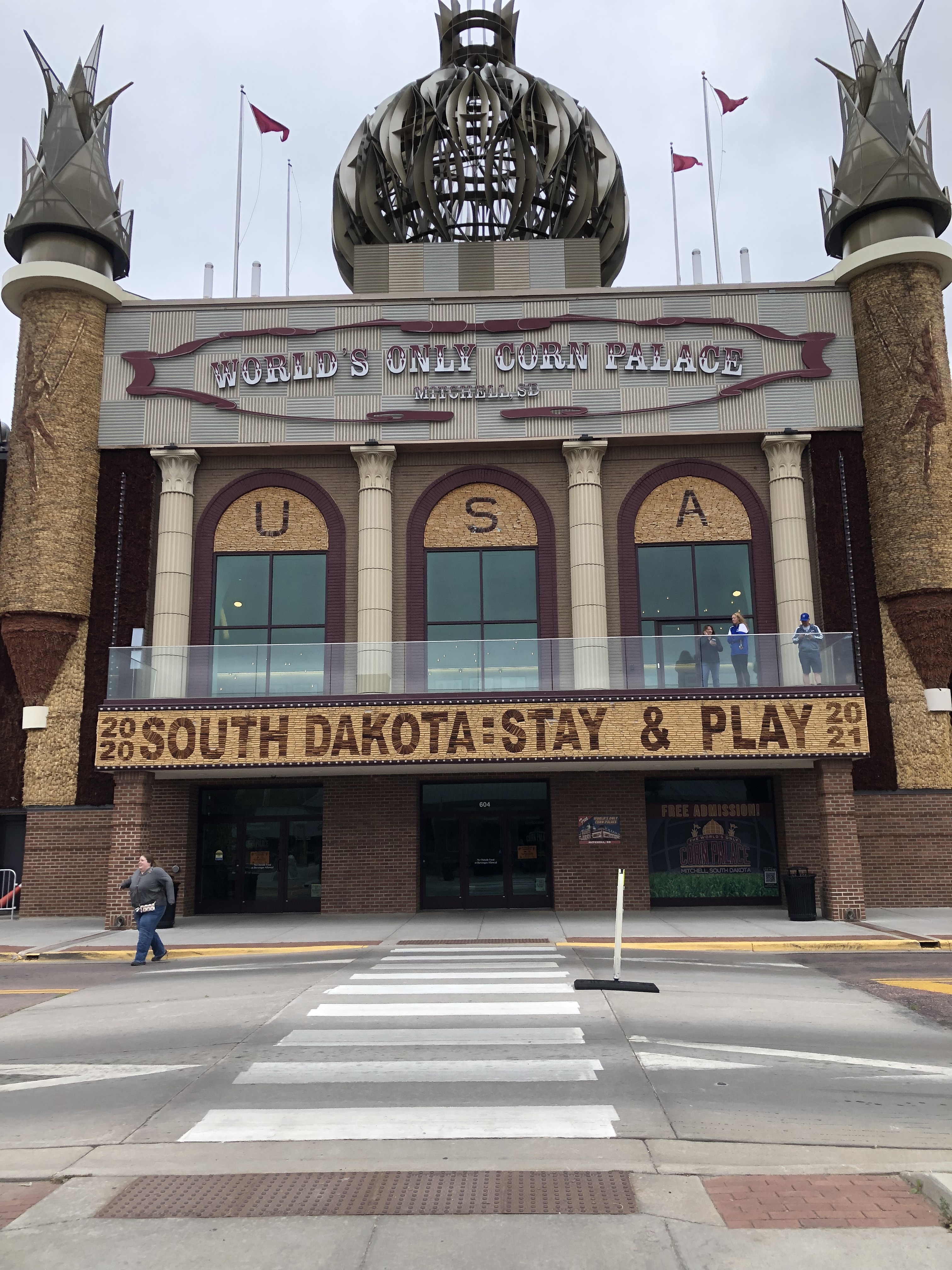 The weather turned cold overnight with a strong wind blowing. It’s a gray 54 degrees when I check out of the Kelly Inn, but it feels a lot colder. “Not ready for this, I can tell you,” says the woman who invites me to sign the guest book at the World’s Only Corn Palace (World’s Only is part of its official name) a few minutes later. In the space for “State,” I put, “WA/MN.” I’m still neither here nor there, though wherever I am, it is now two hours later than my body thinks it should be.