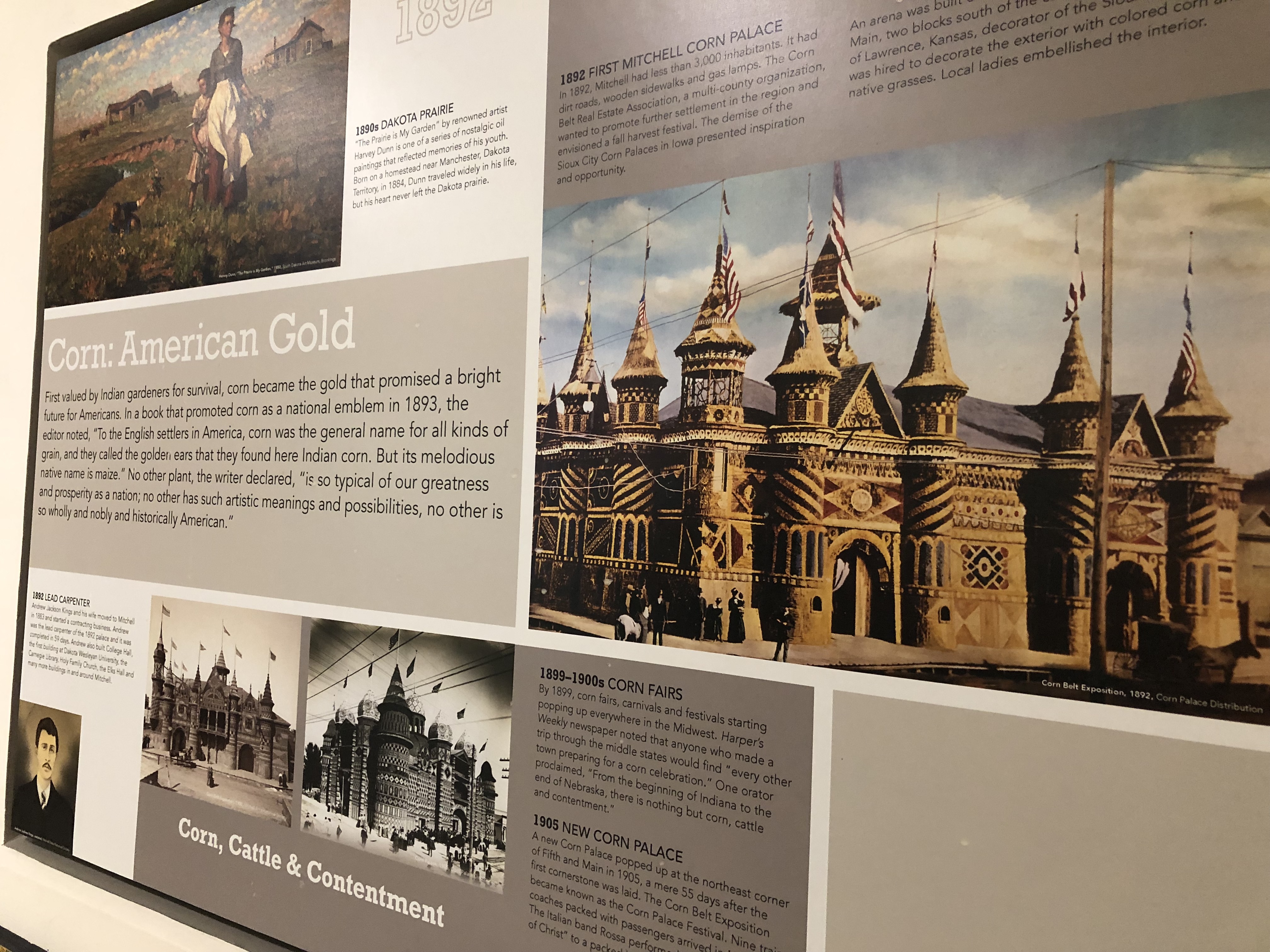Mitchell’s Corn Palace, while unique today, apparently had to jockey for its position among the competition when it was first established near the end of the nineteenth century. Its original purpose was to “prove to the world that South Dakota had a healthy agricultural climate.” Judging by what I saw around me as I drove across the state, the point has been proven, at least as regards corn. The exterior is redone every year, at a cost of $130,000. This year’s Circus mural (I don’t know what else to call it) is still a work-in-progress. The decorating motif of the interior is unremittingly corn(y), but it was fascinating to get some insight into the history of this region. Nonetheless, I was not tempted by the signs inviting me to move there.
