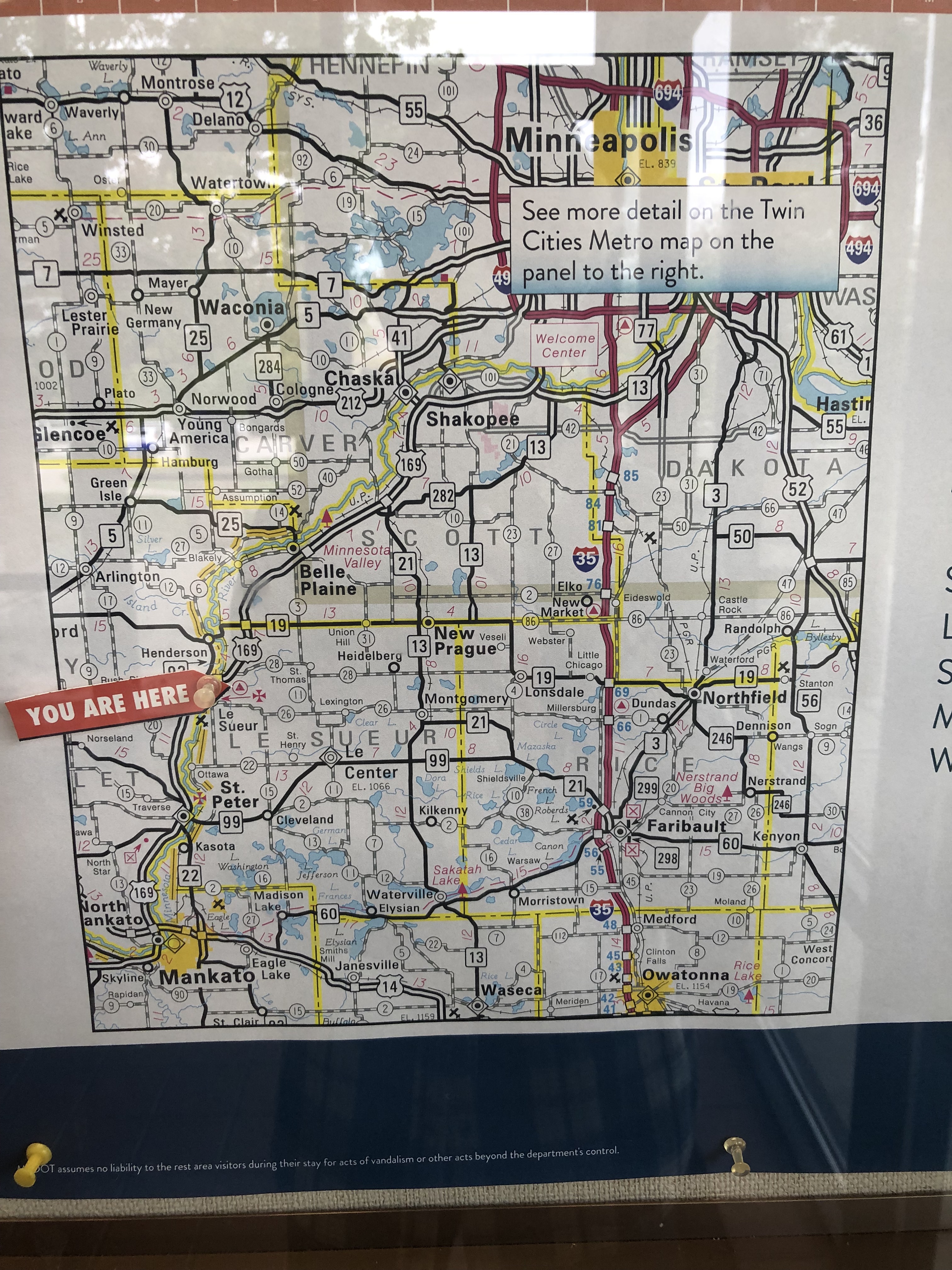 There are notices when I enter the small building about awards won as best rest area. Neat rows of tourist brochures. Maps. Flowers in the ladies room. “That was me,” says the woman at the desk. “I used to put them in the men’s too, but they kept dumping the flowers in the sink and taking the vases.”