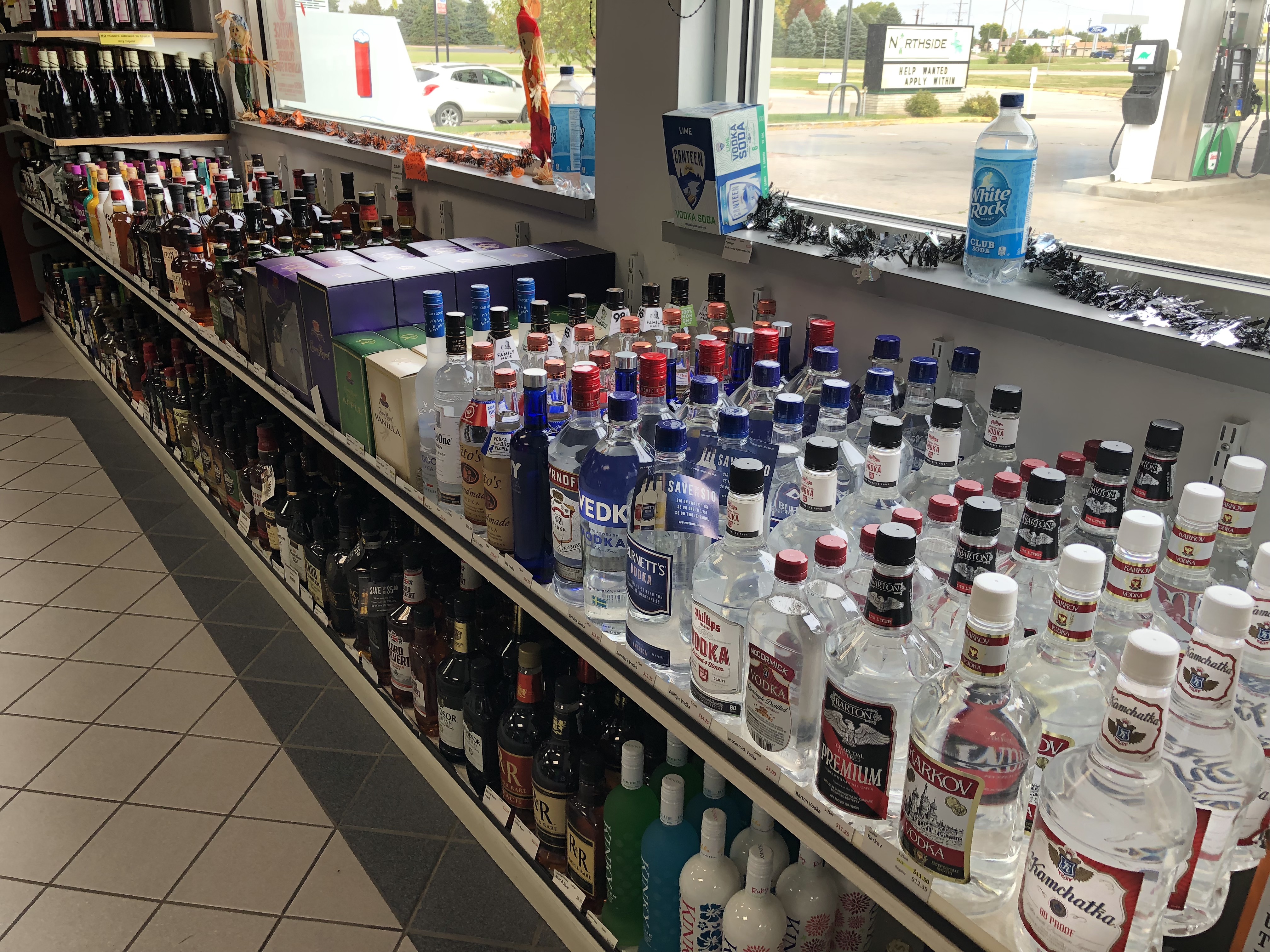 “How much do you want?” the angular young woman at the cash register asks me. I am taken aback. “Uh,” I stumble. “I’m not sure. I just want to fill it up.” “Okay,” she says, “so let’s say we put $50 on your card and you’ll get whatever you don’t use back as a credit.” We agree on $30. On my way out, I am once again taken aback, this time by the size and quantity of the liquor bottles that line a shelf occupying half the front of the store. On my way in, I had been struck by the sign warning hunters to secure their guns. The same sign had been in the Kelly Inn’s lobby and pasted to the door of the Corn Palace. I do my best not to think about the number of guns in my vicinity and trust that no one will shoot me if I take a picture of the signs.