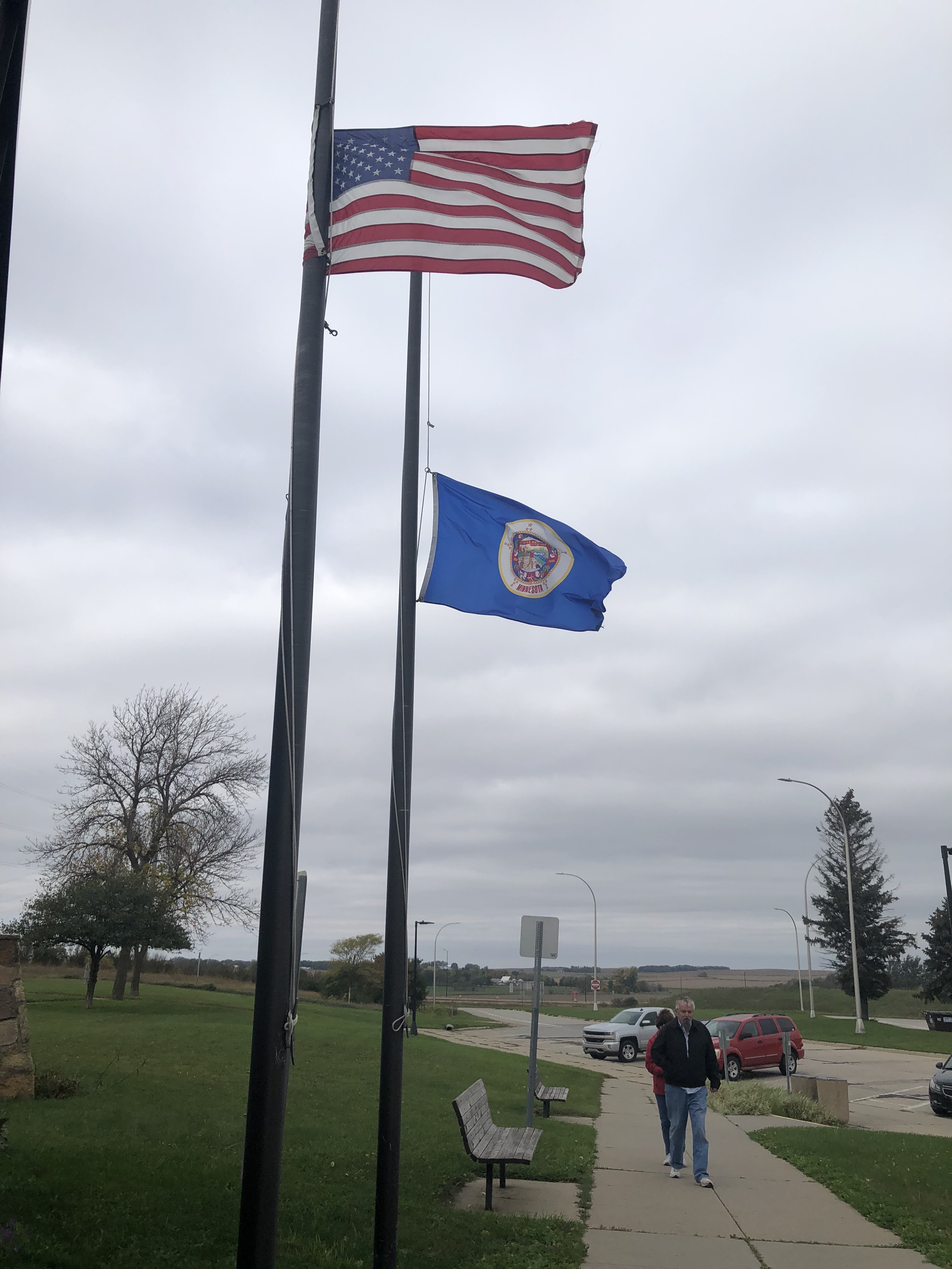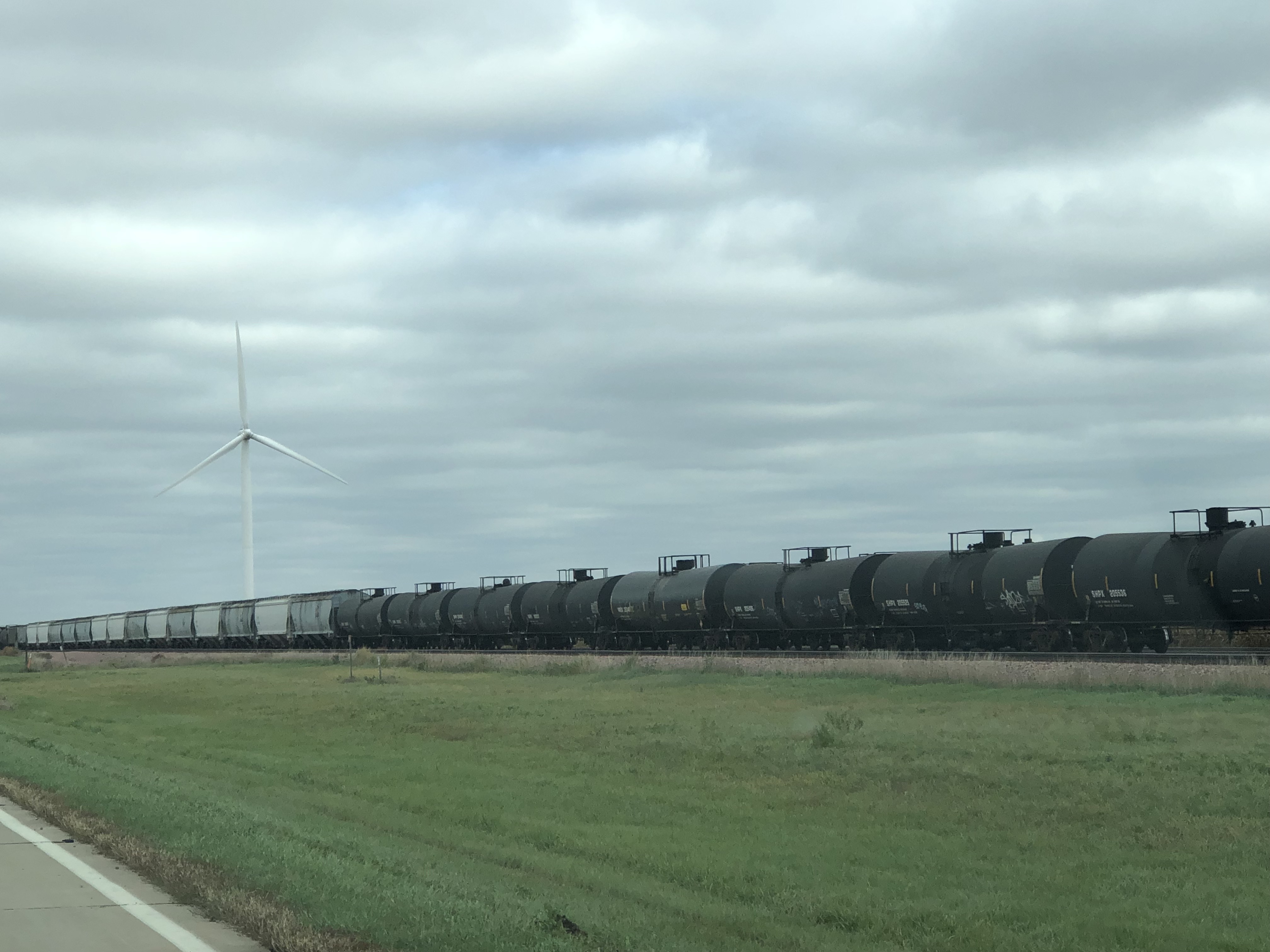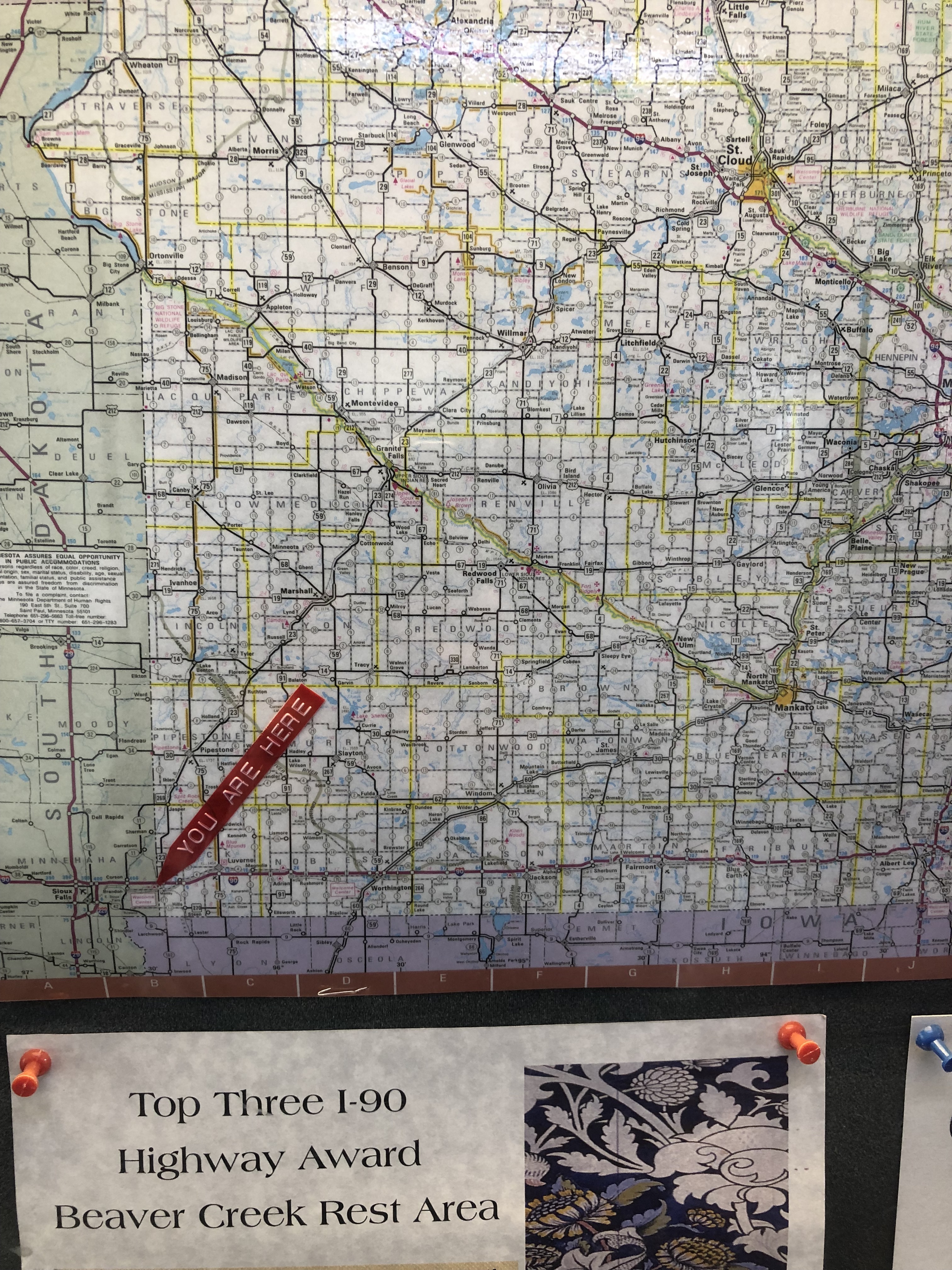 An hour and a half out of Mitchell, I make my first stop. I’m tired and need a break. The layer of clouds has broken into a patchwork, so now the sky is bright. It is still, however, cold and windy. According to the signage and the flag waving beside the Stars and Stripes, I am in Minnesota. I check in with my tracking team. “Find My says you’re still in South Dakota,” they tell me. I look across the expanse of highway to the westbound side of I-90 and see what I’ve come to recognize as the South Dakota teepee. Apparently, Find My can’t handle the subtleties of eastbound vs. westbound.