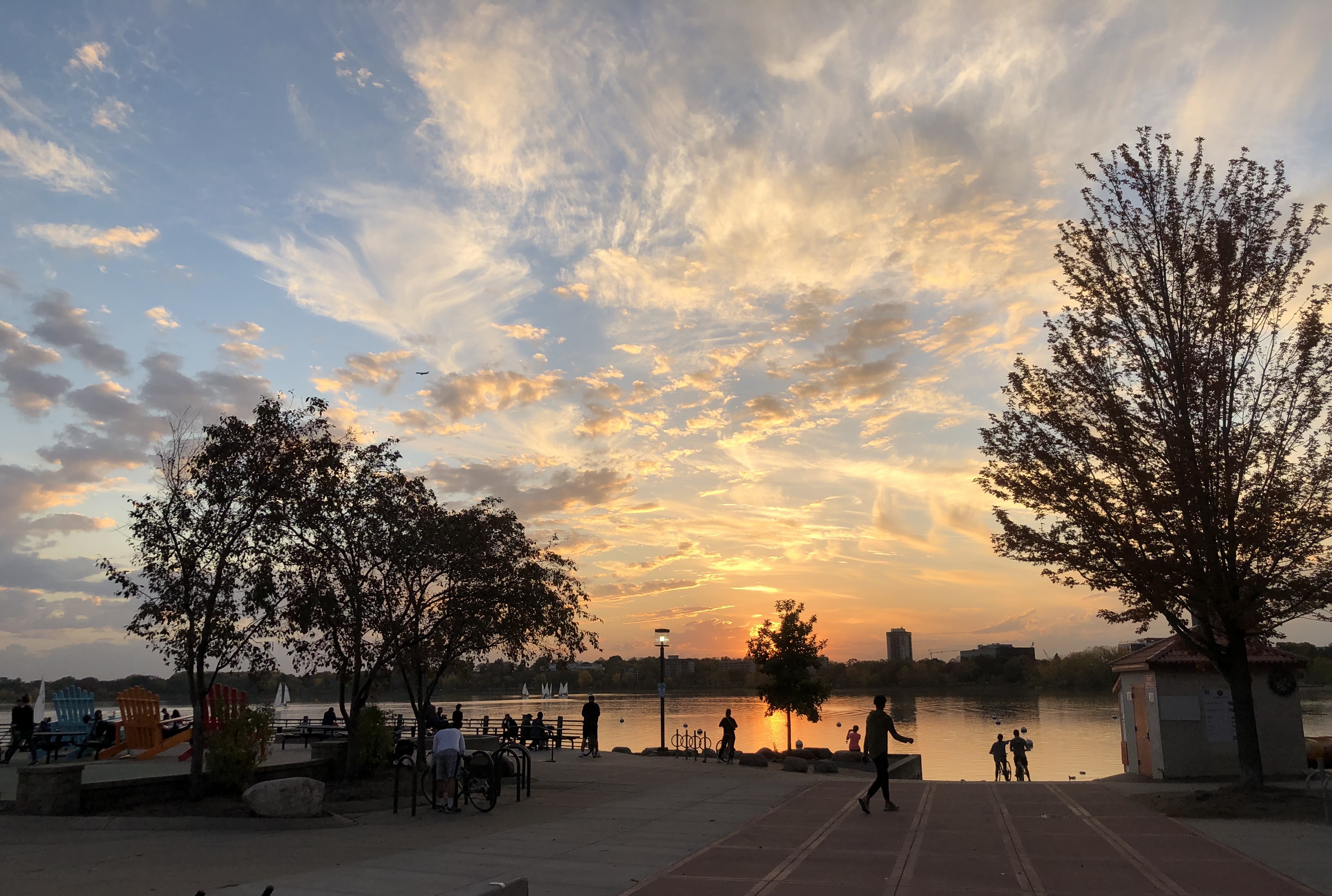 By late afternoon, the skies were still heavy but no longer threatening and I was the only one walking beside the lake at sunset. There was the occasional runner, but that was it. I wondered about the wisdom of walking alone in a darkening park but felt reassured by the proximity of a well-heeled neighborhood of lovely homes and traffic that was close enough for the area not to feel deserted.