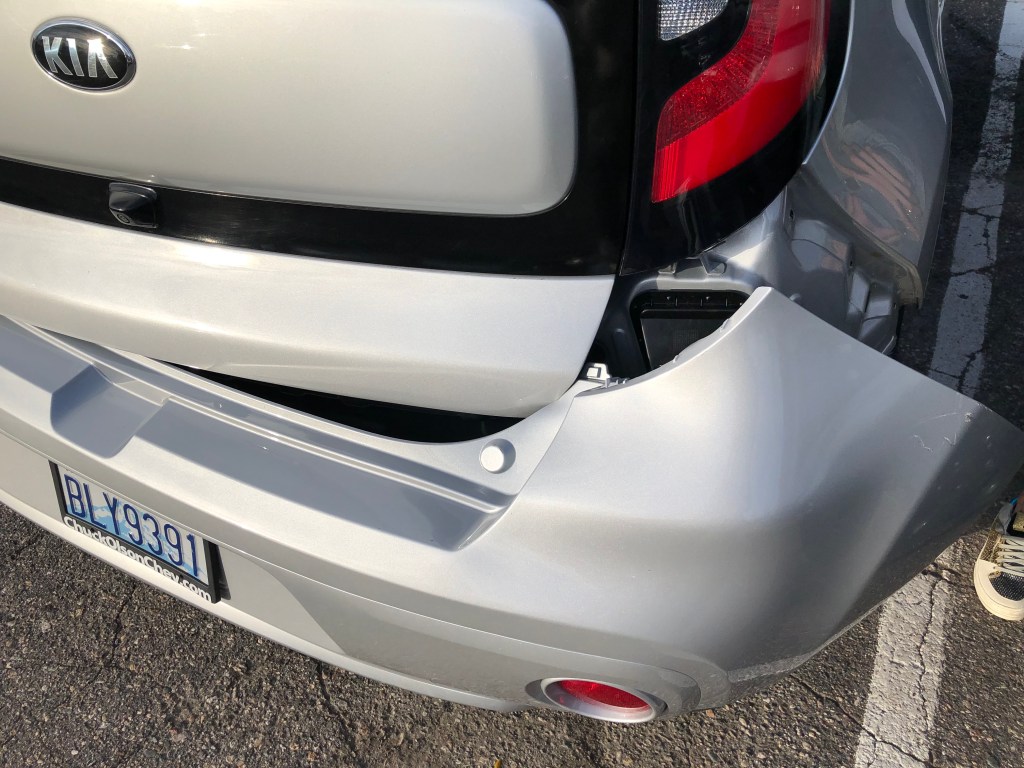 My bumper isn’t in as bad shape as it was two weeks and three days ago, and it wasn’t a hit and run. I have the woman’s insurance information and have filed claims with both her and my company. I have a relationship with the collision center that just gave me a new bumper from the last time and I can bring my car over in the morning to make sure it’s safe to drive. I can’t open my trunk but maybe they can bang the bumper enough into place so it lets me access the trunk release.